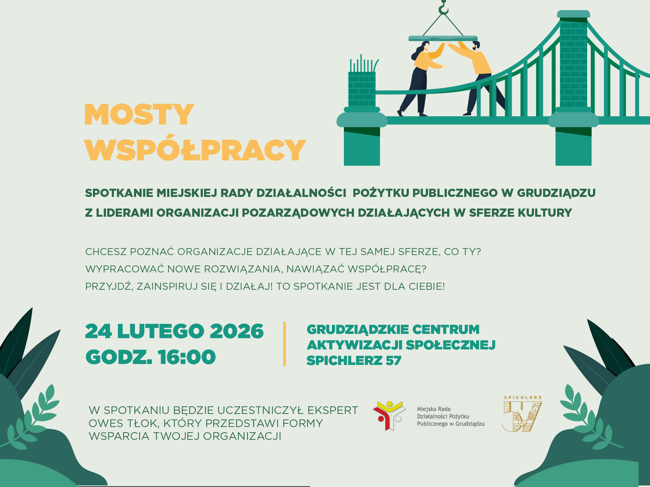 Miejska Rada Działalności Pożytku Publicznego w Grudziądzu zaprasza na kolejne spotkanie z cyklu „Mosty współpracy”. Tym razem spotkanie jest skierowane do organizacji pozarządowych działających w sferze kultury i odbędzie się 24 lutego o godz. 16:00 w Spichlerzu 57.