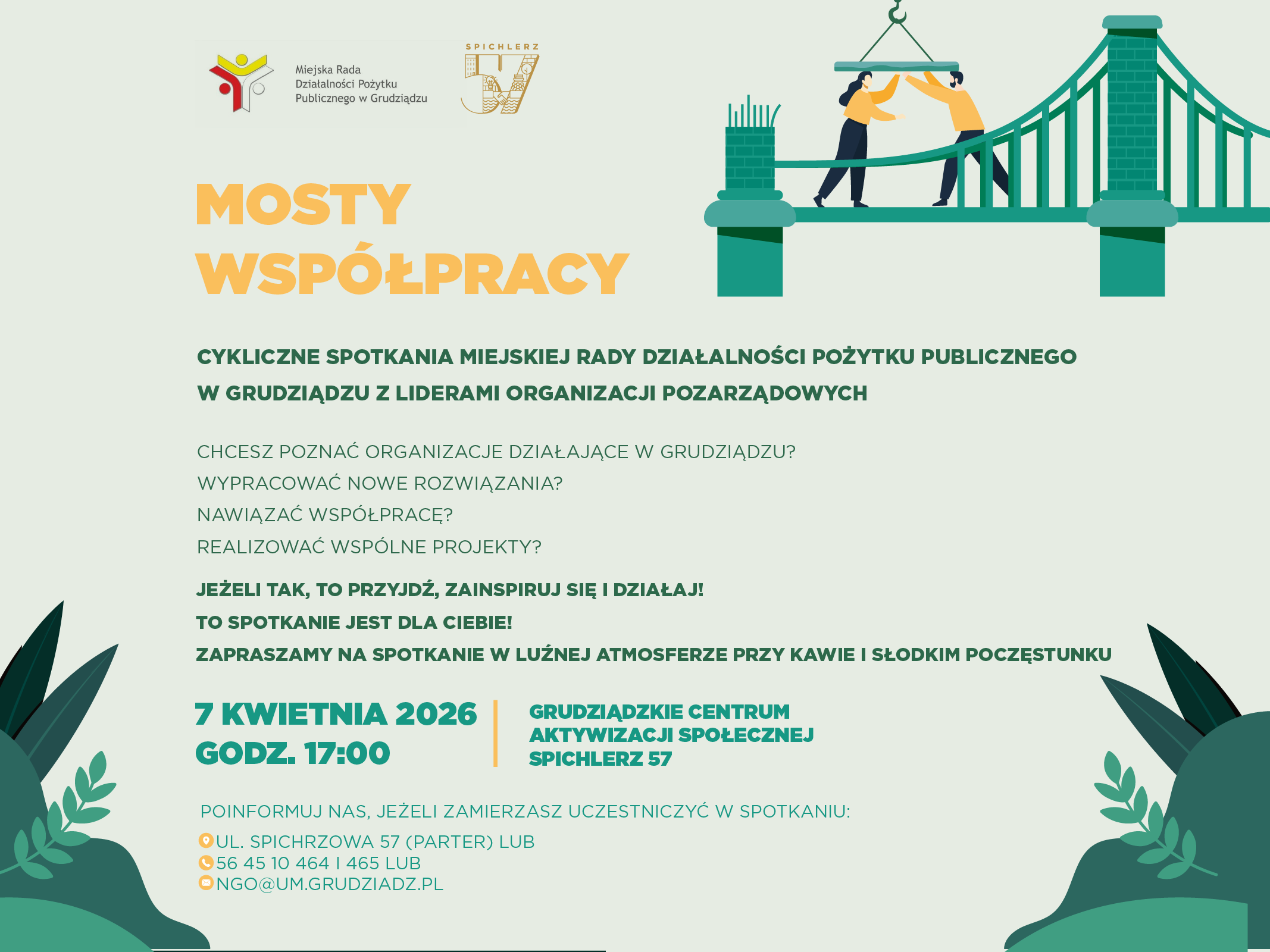 „Mosty współpracy” to cykliczne spotkania przy kawie członków Miejskiej Rady Działalności Pożytku Publicznego w Grudziądzu z liderami grudziądzkich organizacji pozarządowych. Poprzez spotkania i rozmowy pragniemy nawiązać i zacieśnić współpracę Rady z organizacjami oraz pomiędzy samymi organizacjami działającymi na terenie miasta. Chcemy, abyście w trakcie spotkań podzielili się z nami waszymi zarówno bolączkami, jak i sukcesami, chcemy też poznać wasze plany i wizje rozwoju. Ale przede wszystkim pragniemy, aby spotkania te były okazją do bezpośrednich rozmów i wymiany kontaktów. Mamy nadzieję, że doświadczenia i wnioski ze spotkań pozwolą na wspólne poszukiwanie możliwości rozwiązywania problemów i będą prowadzić do realizacji wartościowych i ciekawych projektów na rzecz społeczności lokalnej.